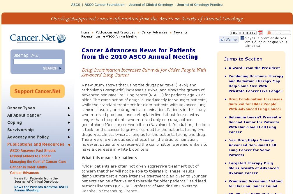 A la suite de la présentation en session plénière à l’ASCO de l’étude IFCT-0501 par Pr Elisabeth Quoix, voici quelques articles dans la e-Presse :